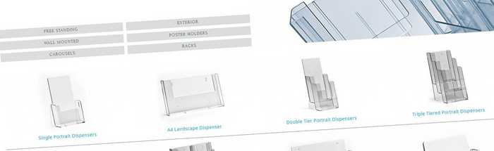 Our online products cater for all needs fromleaflet dispensers, brochure holders, stylish & practical graphic presentation display, 2d display system that optimise surface viewing area and a variety of display accessories.