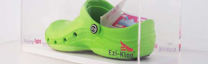 The special ‘Klogg’ was created for the medical trade and has qualities that are necessary for use in sterile environments. This bespoke acrylic display has been designed to make sure the viewer can appreciate the fine details of this shoe as well as making sure the logos are in a strategic position so the prospective buyer’s eye is drawn to the logo imprinting the name in their memory.