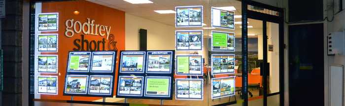 Godfrey Short & Squire are one of many estate agents taking advantage of this high impact, low level displays which are less than one metre high, allowing clear vision into the interior of the office. The office window design utilized two pedestal displays to accent the surrounding LED light pockets.
