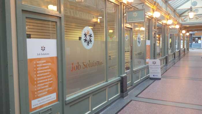 Durleigh where recommended to Job Solutions a recruitment company, for the supply and fitting of frosted vinyl to the shop font windows and doors, as a modesty film. On having a discussion with the manager, I found that the company although new to the area had years of industry knowledge and the company goals where clear. This is where we suggested that the office needed to reflect the experience and get the message over to prospective applicants. Our experienced design team came up with a simple plan to create graphics to match their business image and literature. The result was brilliant and will be seen by thousands of shoppers in the Bridgwater Town centre, delivered on time and on budget.