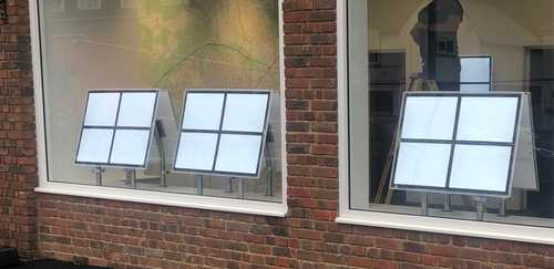 The free standing LED illuminated displays are a range of low level pedestal displays designed for office windows. This range of Fairfield freestanding displays are high-bright LED illuminated display panel mounted on high grade brushed stainless steel posts. These are typically mounted on a window ledge plinth or floor standing with a silver aluminium base. This Fairfield range is a single sided display for posters and property details. These freestanding displays come assembled as standard each with a 3 pin UK plug for easy installation.